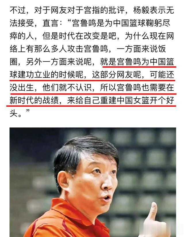 但杨毅也并非觉得,女篮本次亚洲杯的失利,宫鲁鸣没有责任。杨毅给出的理由是,宫鲁鸣离开一线太久了,各方面都没有做好准备。言外之意就是,需要给宫指导时间去证明自己。